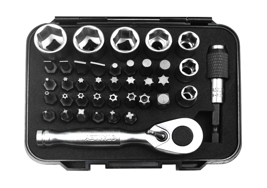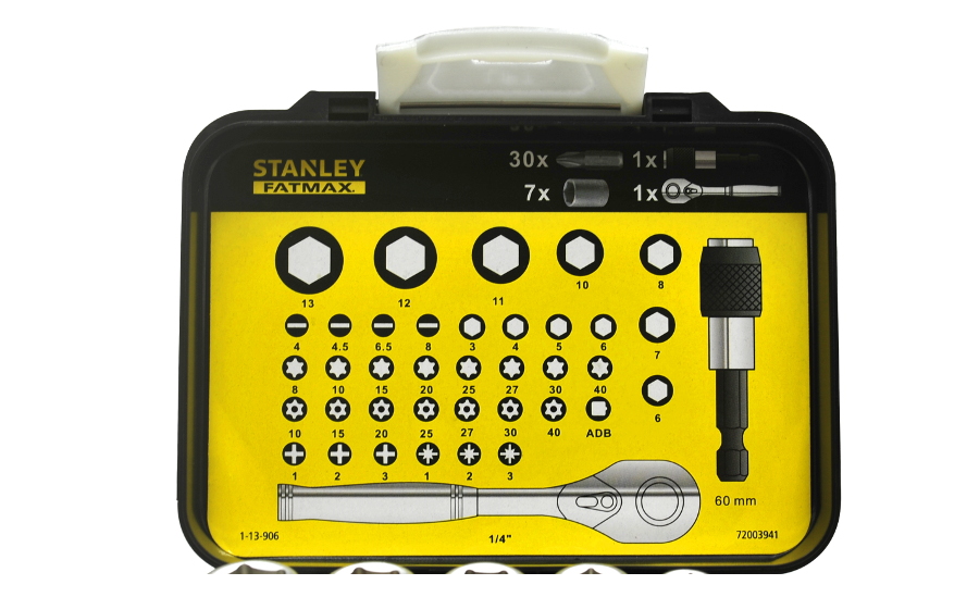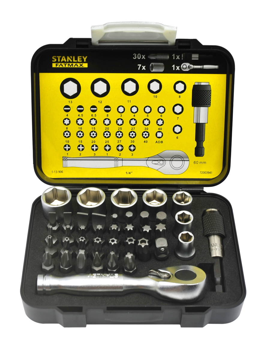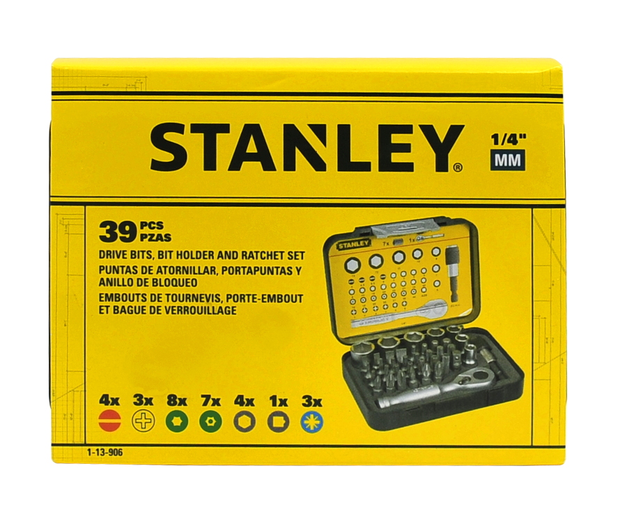 Zestaw kluczy nasadowych renomowanej marki STANLEY składający się z 39 elementów. Jest to mały poręczny zestaw narzędzi 1/4". Zestaw jest niezastąpiony przy pracy gdzie jest zbyt mało miejsca na standardowe klucze. ➜ Uchwyt magnetyczny z blokadą 60mm ➜ Bity płaskie: ➜ Phillips: ➜ Pozidriv: ➜ Sześciokątne: ➜ Torx: ➜ Torx z otworem: ➜ Nasadki 1/4”: ➜ Grzechotka 1/4” 90mm