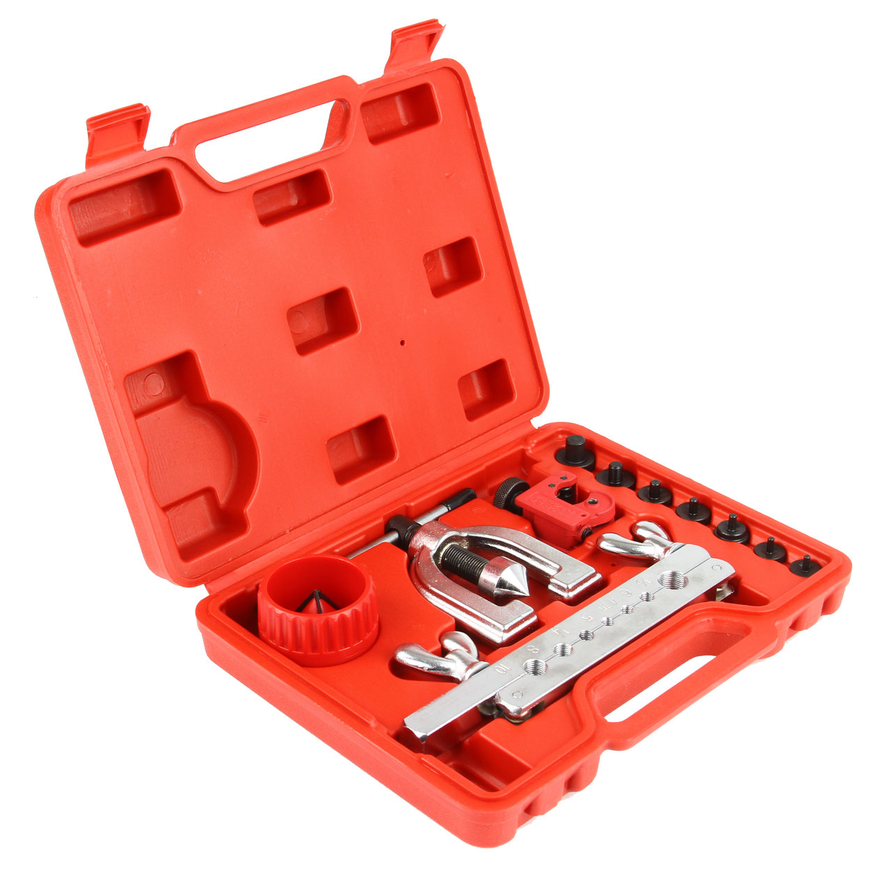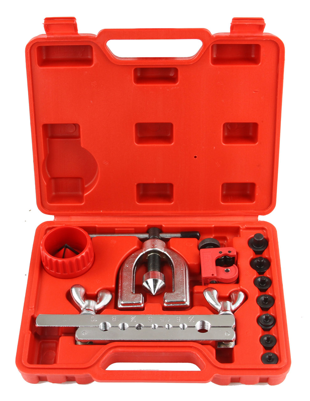 Uniwersalny zestaw do zarabiania przewodów hamulcowych i rurek + obcinak + gradownik. Dedykowany do warsztatów samochodowych, motoryzacyjnych i serwisowych a także majsterkowiczom i do zastosowań w przydomowym warsztacie. Do zarabiania końcówek hamulcowych oraz mechanizmów hydraulicznych w samochodach i sprzętach. Do manualnego rozszerzania i zagniatania przewodów i rurek różnego rodzaju. Do końcówek przewodów wykonanych z m.in. z aluminium czy miedzi. W zestawie znajdują się najpopularniejsze końcówki umożliwiające zarobienie przewodu hamulcowego do większości samochodów dostępnych na rynku europejskim i amerykańskim. Solidnie wykonana zarabiarka odporna na pęknięcia i uszkodzenia. Całość zestawy umieszczona w poręcznej, ułatwiającej transport i przechowywanie walizce 》》》 ZESTAW PRASKA DO ZARABIANIA PRZEWODÓW HAMULCOWYCH 11el M57751 《《《